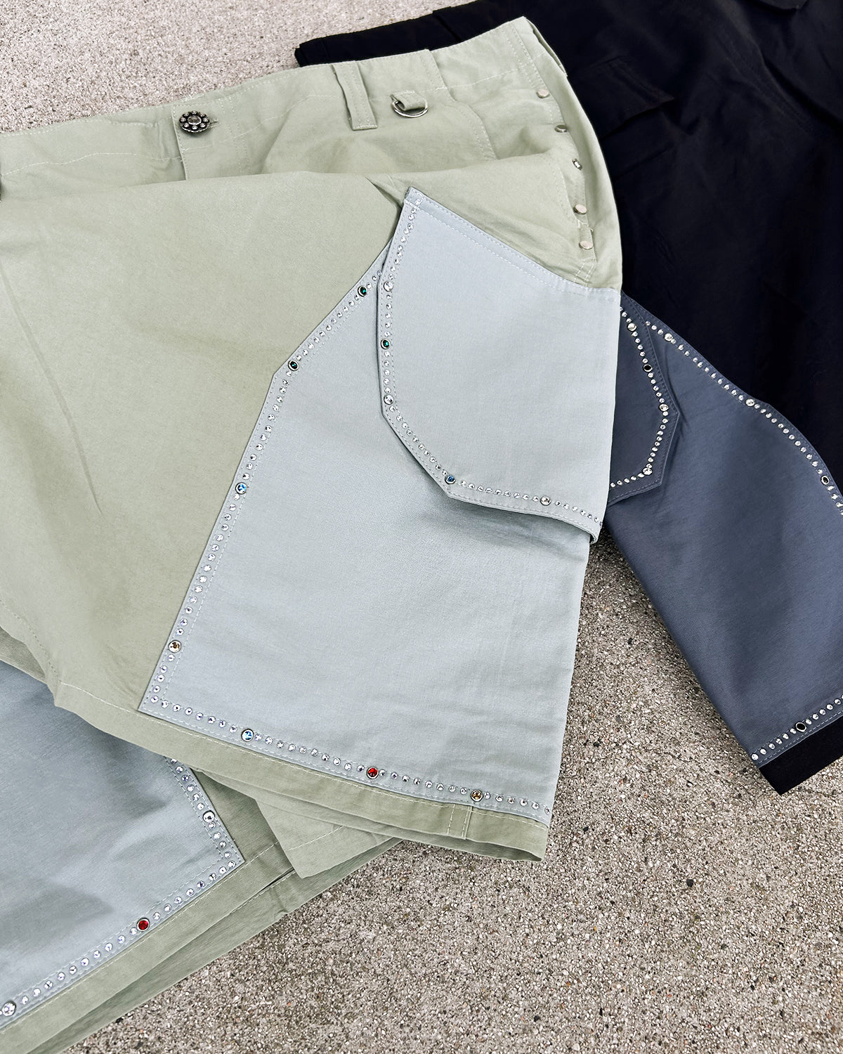 Traditional cargo short silhouette with our new wider, baggier fit. Made of premium polyester nylon in a contrast two tone, finished off with rhinestone embellishments along the cargo pockets and silver flat head studs along the side pocket openings.