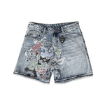 Heavy weight, high quality denim with a custom wash in a wider and baggier fit. Features an assortment of multi color, warped “LALA” self patches across the front. Raw edge finish and guitar pick holder key chain attached.