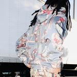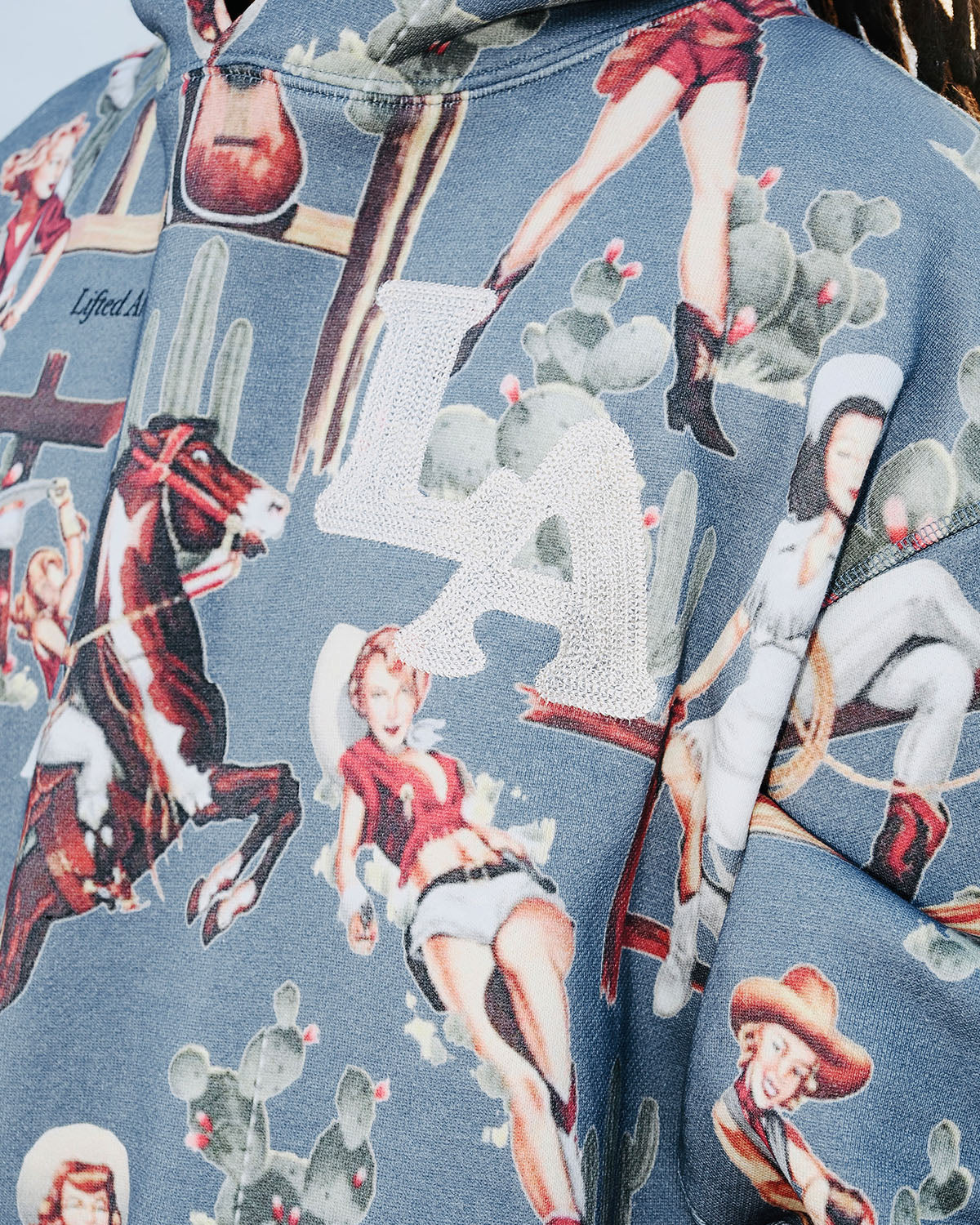 Traditional boxy, hooded sweatshirt silhouette made of a heavyweight high quality cotton fleece fabric. Features our custom enlarged “Hoe Down” all over print. Fits true to size. Model is 6’0 wearing a size large.