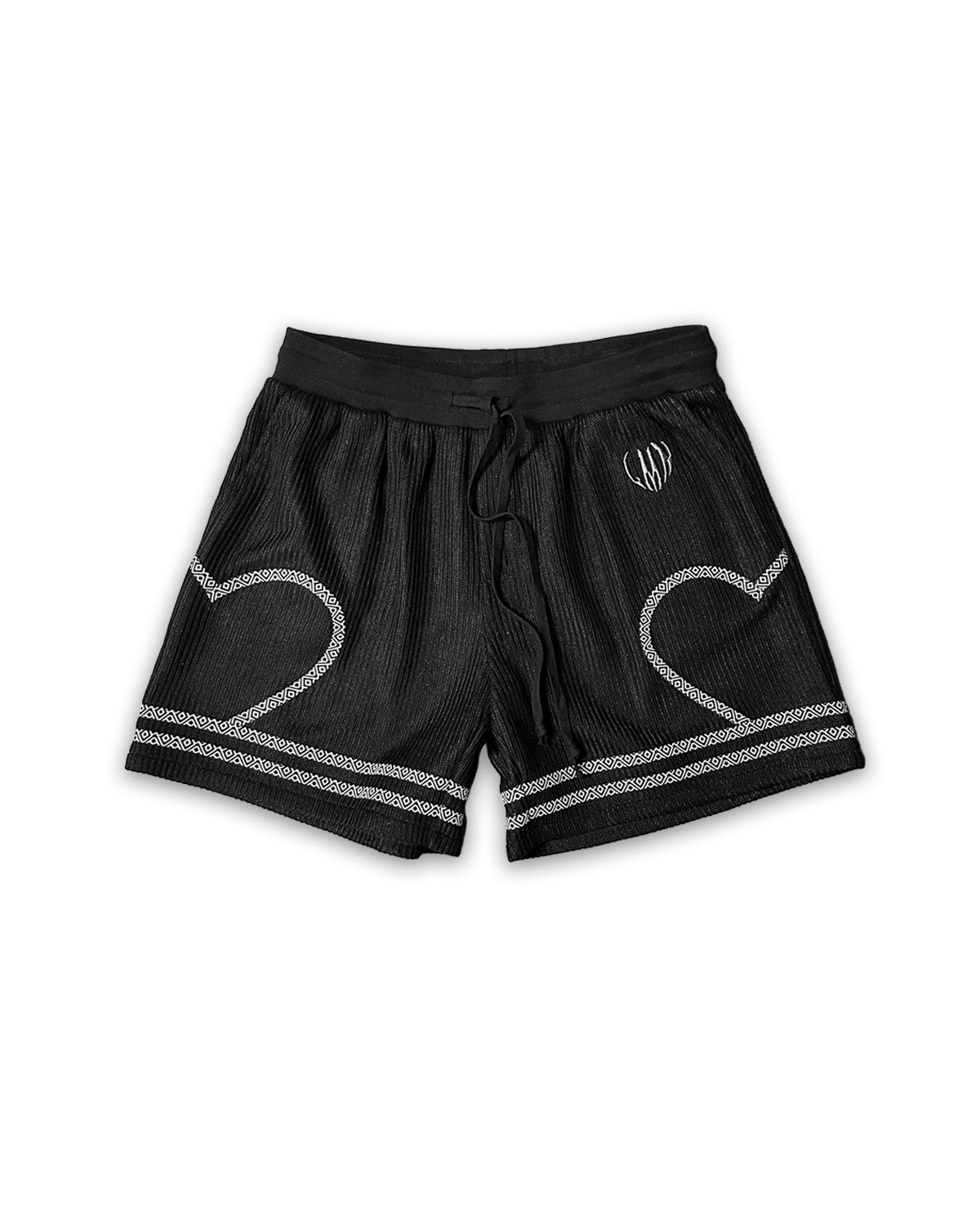 Traditional basketball short silhouette made of high quality jacquard knit fabric with a custom tribal print contrast trim taping around the bottom openings, topped off with an elastic waistband and puff embroidered "Love Means Nothing" heart motif.